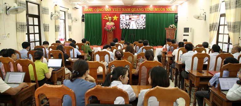 Các đại biểu ở xã Sơn Tây Thượng dự Hội nghị tại điểm cầu Hội trường Đảng ủy xã Sơn Tây Thượng