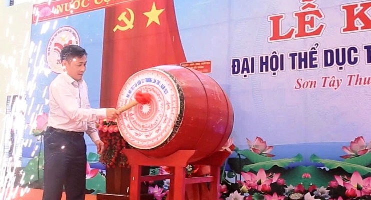 Bí thư Đảng ủy, Chủ tịch HĐND xã Sơn Tây Thượng - Trần Hoài Thu, đánh trống khai mạc Đại hội Thể dục thể thao xã Sơn Tây Thượng lần thứ I năm 2025